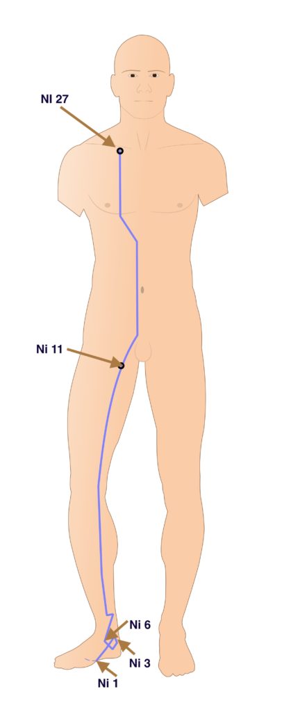 Der Meridian zieht weiter an der Innenseite des Oberschenkels aufwärts, verläuft über den Unterbauch und tritt in die Körperhöhle ein, wo er mit den Nieren und der Blase verbunden ist. Ein weiterer wichtiger Punkt ist Ni 6 unterhalb des Innenknöchels – häufig genutzt, um Schlaf, Hormonsystem und emotionale Ausgeglichenheit zu regulieren. Auf Höhe der Schambeinfuge liegt der Punkt Ni 11, der den Fluss der Lebensenergie im Beckenraum unterstützt und eng mit den Themen Sexualität, Fortpflanzung und Verwurzelung verbunden ist.